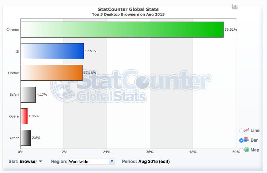 圖示:2015年8月全球不同瀏覽器市場占有率統(tǒng)計(數(shù)據(jù)來自StatCounte)